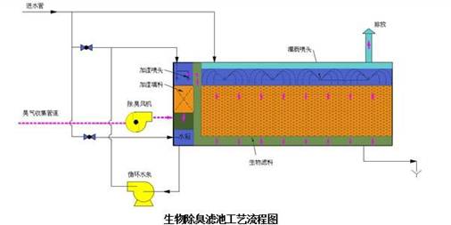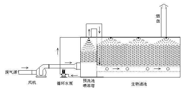 惡臭氣體收集裝置→預(yù)處理裝置→生物過濾裝置→抽風(fēng)機(jī)→達(dá)標(biāo)排放