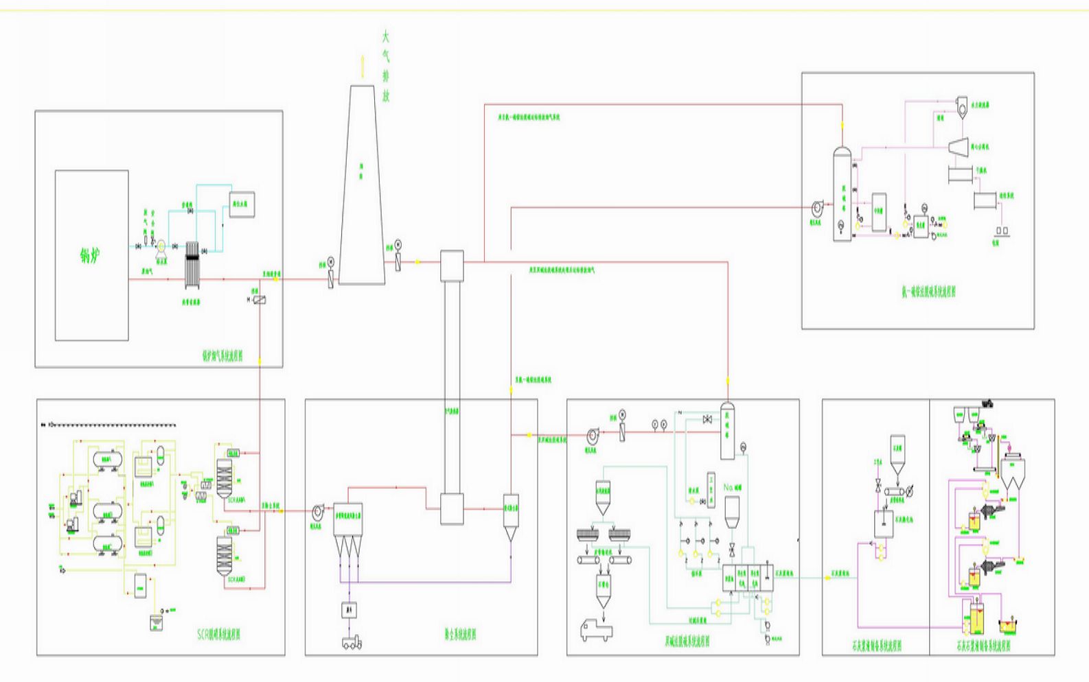 脫硝除塵脫硫一體化設(shè)計(jì)流程:煙氣→增壓風(fēng)機(jī)→余熱回收裝置(省煤器)→換熱器→脫硝脫硫除塵一體塔→換熱器→高空排放。