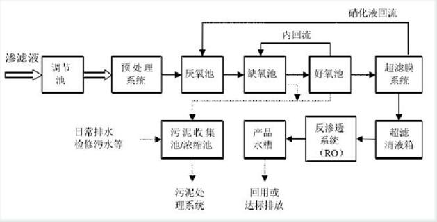 通過以上對垃圾滲濾液的各污染物分析及其水質(zhì)水量受當(dāng)?shù)貧夂蚝屠盥駡觥澳挲g”的影響,對處理方法一一進(jìn)行說明和比較,結(jié)合生活垃圾滲濾液的具體情況以及污水處理的目的、投資、占地面積、能耗、運(yùn)行費(fèi)用、管理方面程度、運(yùn)行可靠性及使用壽命等綜合因素的分析,以及我公司根據(jù)大量前期調(diào)研結(jié)果、吸收國內(nèi)外滲濾液處理的經(jīng)驗并結(jié)合多年廢水治理的實踐經(jīng)驗,在進(jìn)行充分、合理分析污水處理系統(tǒng)運(yùn)行過程中將會出現(xiàn)的水質(zhì)沖擊負(fù)荷及當(dāng)?shù)氐木唧w氣候等情況后,特采用以下工藝: